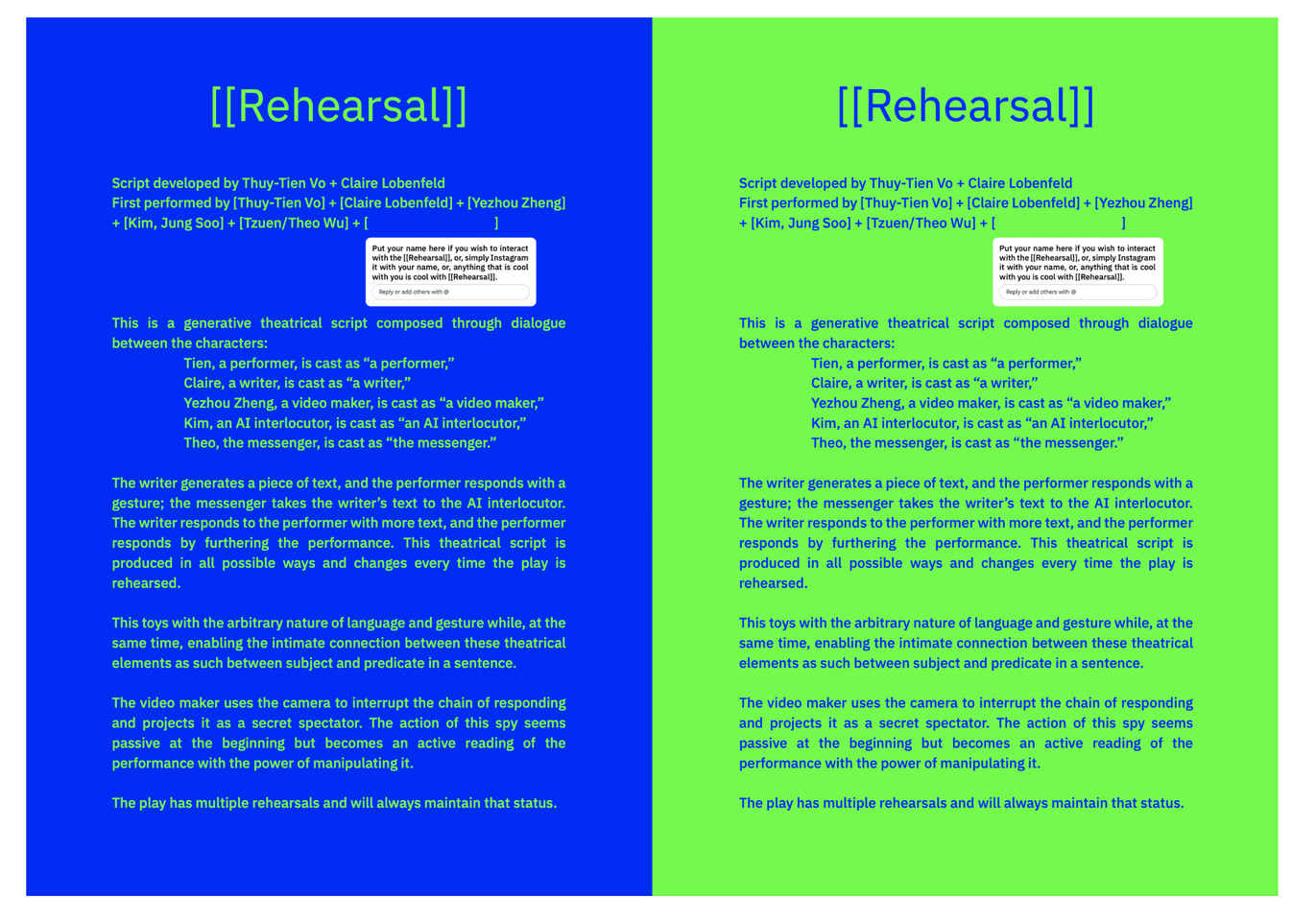 The writer responds to the performer with more text, and the performer responds by furthering the performance. This theatrical script is produced in all possible ways and changes every time the play is